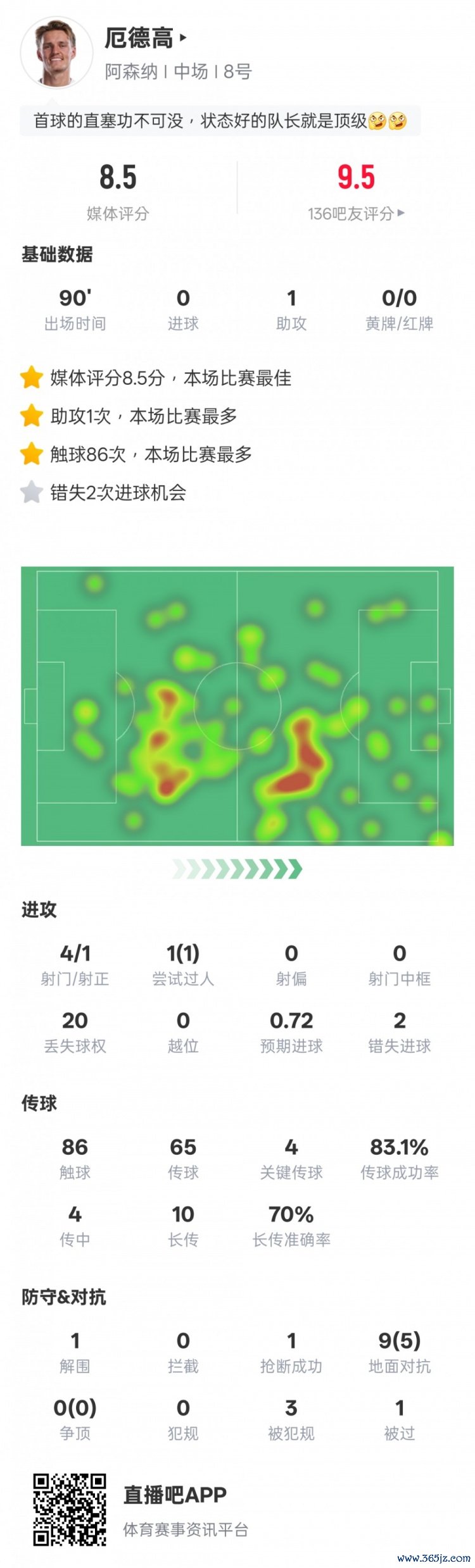 10月2日讯 欧冠联赛阶段第2轮,阿森纳2-0奥林匹亚科斯。本场比赛,厄德高首发出战,送出1次助攻,4次重要传球,但也有2次错失进球契机,评分8.5全场最高。