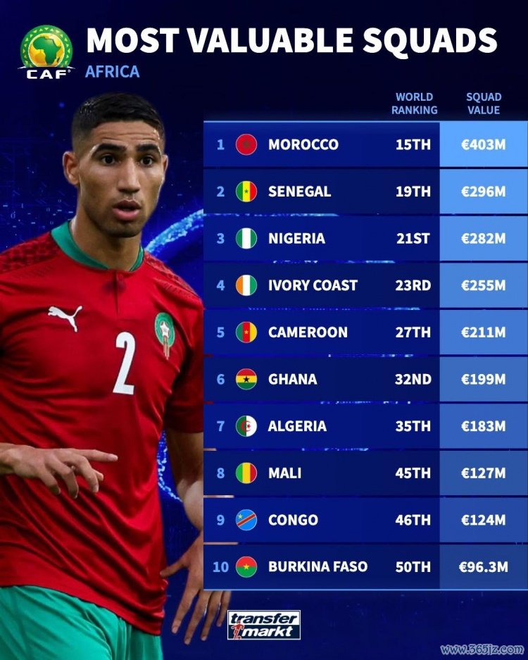10月12日讯 德国转会市集网更新非洲足联国度队身价名次,2022宇宙杯四强球队摩洛哥以4.03亿欧元总身价高居榜首,塞内加尔(2.96亿欧元)与尼日利亚(2.82亿欧元)分列二、三位。