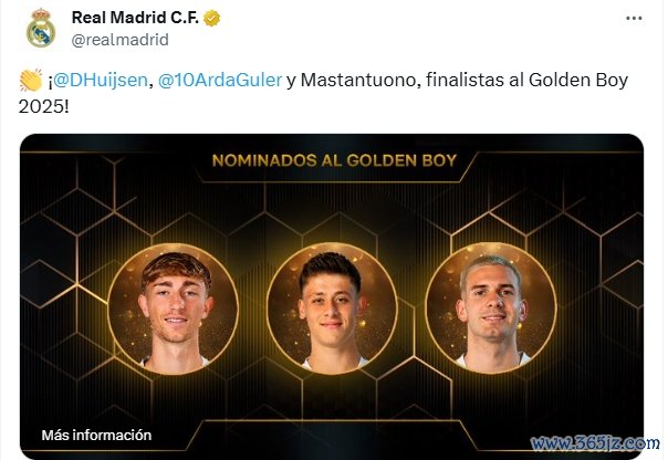 10月16日讯 《齐灵体育报》公布2025年金童奖25东谈主候选,皇马有三东谈主入选,诀别是赫伊森、居莱尔和马斯坦托诺。