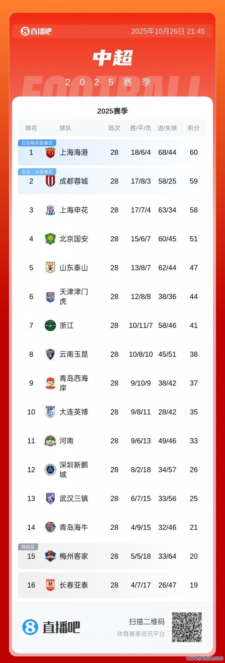 透顶尖锐化!中超还剩2轮,正数3名、倒数3名之间均1分之差