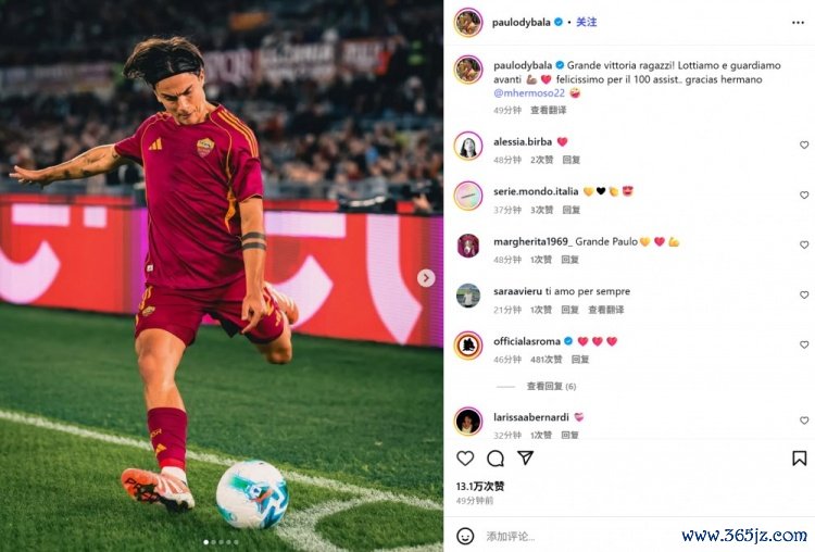 迪巴拉也在赛后通过社媒晒出我方的比赛照,并记念说念:“太棒了,店员们!让咱们赓续死力前进💪🏽❤️ 很是欢乐拿到第100次助攻……谢谢昆玉@埃尔莫索 🤪”