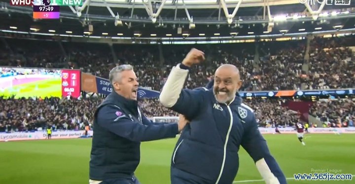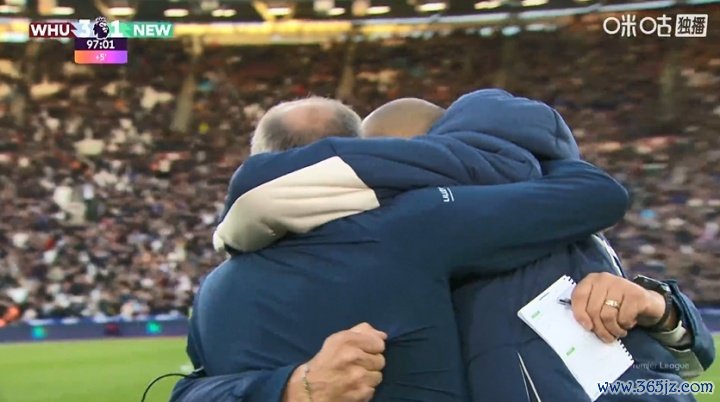 下半场补时第5分钟,绍切克补射破门匡助西汉姆锁定胜局,主帅努诺在场边与阐述注解组昂然相拥。