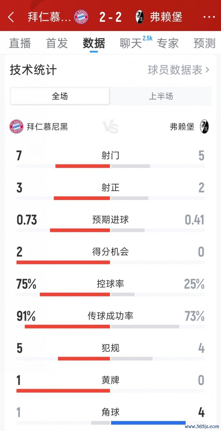 11月22日讯 在本轮德甲拜仁对阵弗赖堡上半场为止,两边2-2暂时战平,以下为两边半场数据对比: