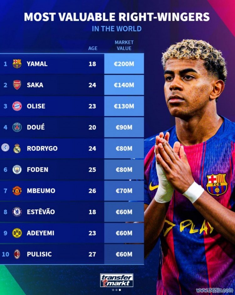 11月3日讯 德转列现时寰宇足坛右边锋身价排名,亚马尔2亿欧居首,萨卡1.4亿欧第二,奥利塞1.3亿欧第三。
