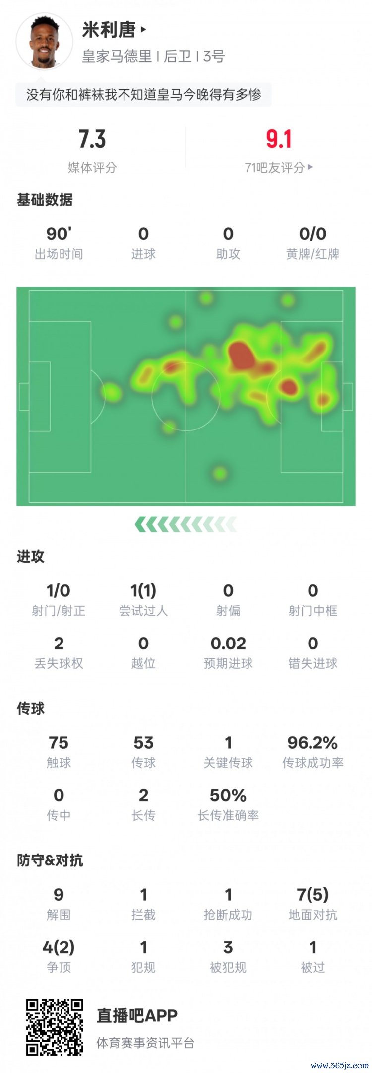 11月5日讯 欧冠联赛阶段第4轮,皇马客场0-1不敌利物浦。米利唐本场首发出战,送出1次关键传球,9次突围,传球见遵循96.2%,评分7.3。