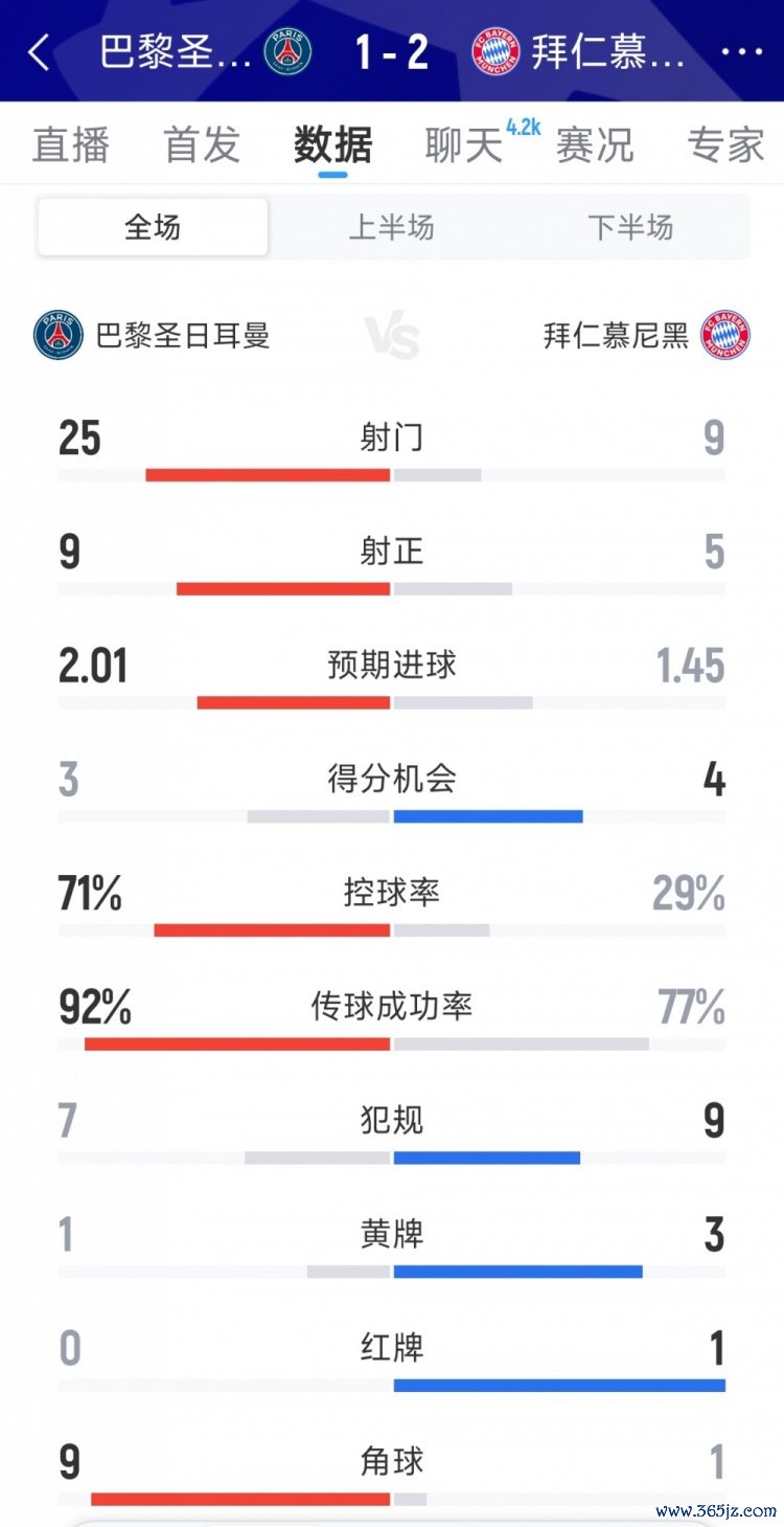 11月5日讯 在本轮欧冠,拜仁2-1打败巴黎,以下为两边全场数据对比: