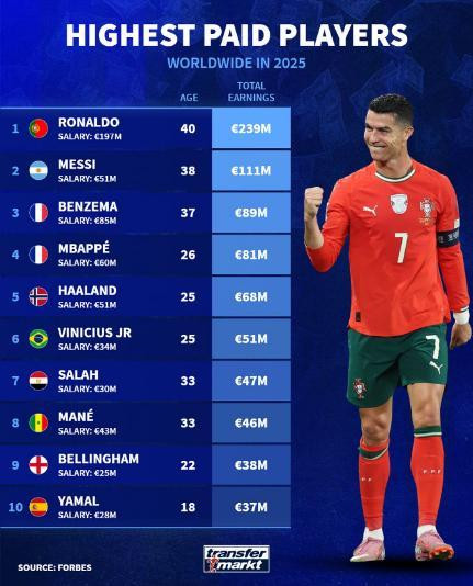日前,德国《转会商场》网站公布了2025年足球通顺员收入名次榜,其中40岁的C罗以2.39亿欧元的年收入排在榜首,38岁的梅西以1.11亿欧元年收入排名第二,旷世双骄是唯二年收入过亿欧元的球员。新双骄姆巴佩和哈兰德齐干预了年收入榜前十,永诀排在第四和第五位。值得一提的是,年仅18岁的西班牙新星亚马尔也干预了前十。