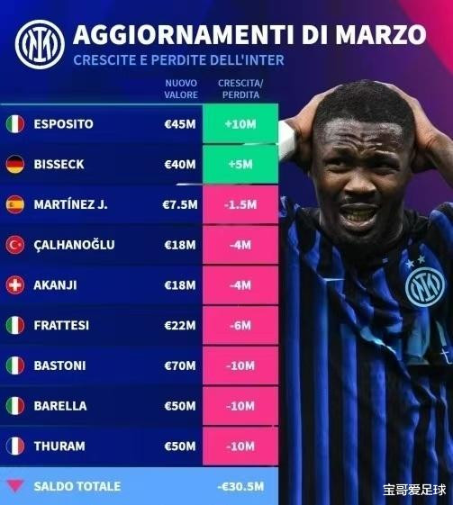 除了锋线、中场球员和后防线这三大核心球员身价都大幅下跌以外,国米还有4位球员的身价也出现了下跌。26岁的意大利中场球员弗拉泰西身价从2800万欧元降至2200万欧元,减少了600万欧元,主要因为他本赛季的出场时间不稳定,未能持续拿出亮眼表现。32岁的中场球员核心恰尔汗奥卢身价下跌400万欧元,目前只有1800万欧元,年龄增长加上近期竞技状态 起伏,使得他的身价小幅下滑。30岁的中后场球员阿坎吉同样因为年龄关系,身价缩水了400万欧元,从2200万欧元降至1800万欧元。27岁的后备 守门员何塞普马丁内斯出场机会寥寥,身价下跌150万欧元,目前仅剩750万欧元。
