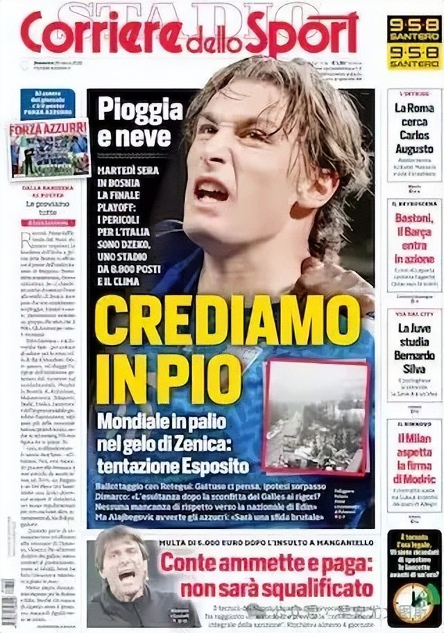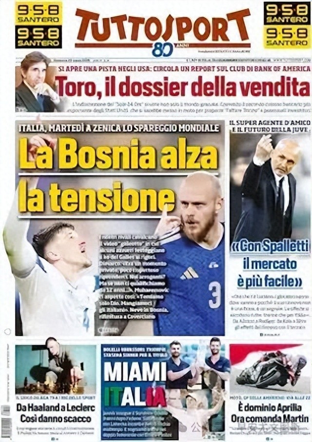 1、波黑加剧了焦灼 局势:意大利,周二在泽尼察决定世界杯赛 总决赛 圈门票归属。我们的对手在看到某些蓝衣军团的球员庆祝他们罚球决胜 出回合威尔士后感到忿忿不平,迪马尔科:“这是一个私人时刻,不是不尊重接下来的对手。我们傲慢?但我们已经12年没有参赛资格了。”穆哈雷莫维奇是这样等待他们的:“我们只敬畏上帝,让我们尽情享受意大利人的盛宴”。波斯尼亚下雪,在科维尔恰诺完成最后的练习 。