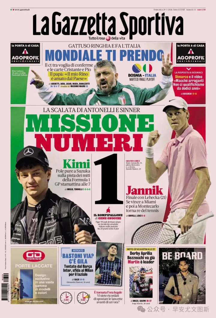 1、任务都是第一:安东内利和辛纳的攀登。基米:在铃木站又一次夺得首发,与一级方程式传奇人物并列,周日早上正式比赛。扬尼克:总决赛 对阵莱赫卡,如果在迈阿密和蒙特卡洛获胜,辛纳将再次成为网球运动活动 之王。