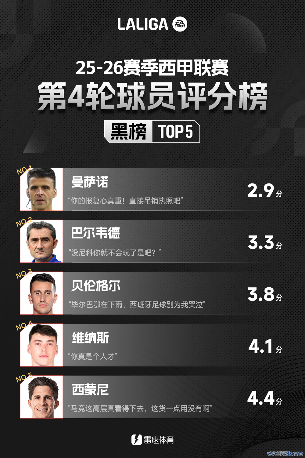 至于黑榜方面,在皇马vs皇家社会一役作念出屡次争议判罚的主裁判曼萨诺则无悬念上榜,也称为西甲红黑榜栏目拓荒以来首位上榜的裁判东说念主员,诸君老哥,以后遇上他王法的比赛可要贯注了!