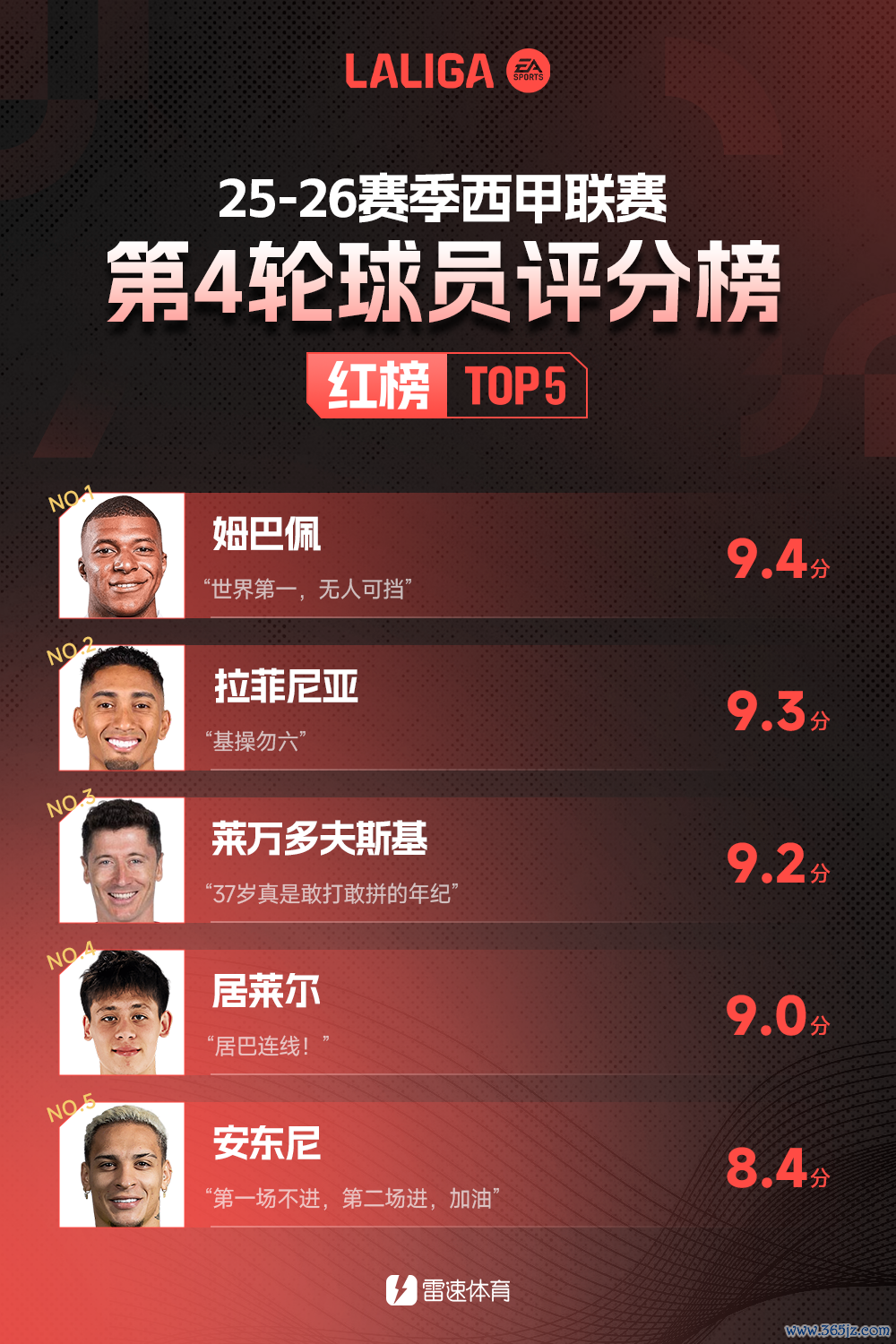 雷速体育9月15日讯 狭隘的国外比赛日事后,新赛季西甲第四轮比赛已于上个周末重燃战火。如今本轮10场比赛一说念战罢,让咱们来望望齐有谁登上了雷速体育本赛季第四期西甲红黑榜~