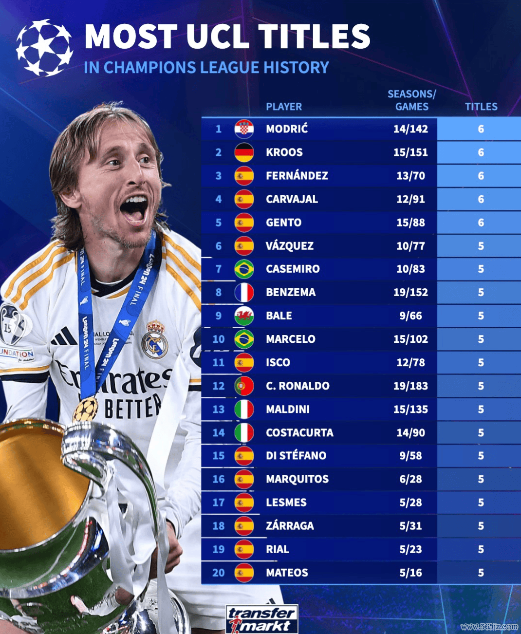 2.克罗斯(德国,皇马):15个赛季/151场,6次