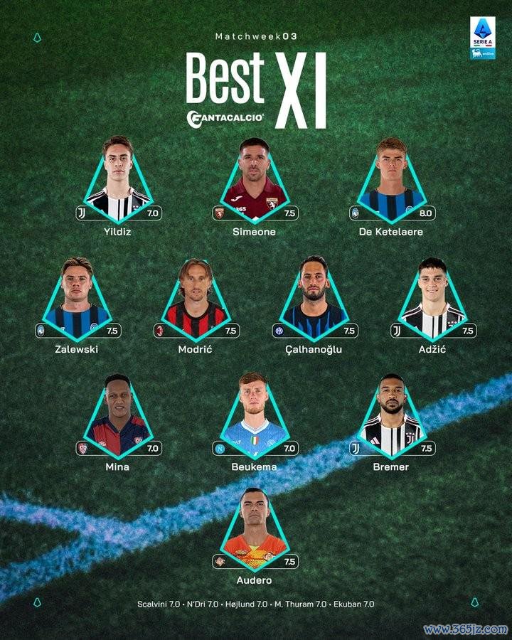 意甲官方公布了第3轮联赛最好威望,莫德里奇、凯南-伊尔迪兹和布雷默等东说念主在列。