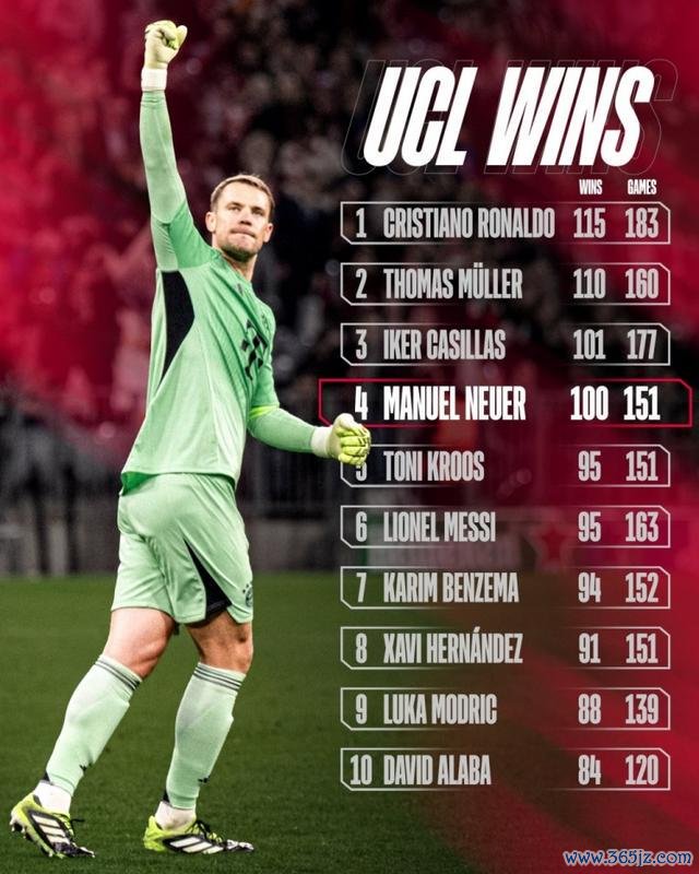 直播吧9月19日讯 拜仁在昨晚的欧冠焦点战3-1力克切尔西,诺伊尔成为历史第4位欧冠100胜球员。拜仁官方也列出了欧冠历史胜场榜记录。