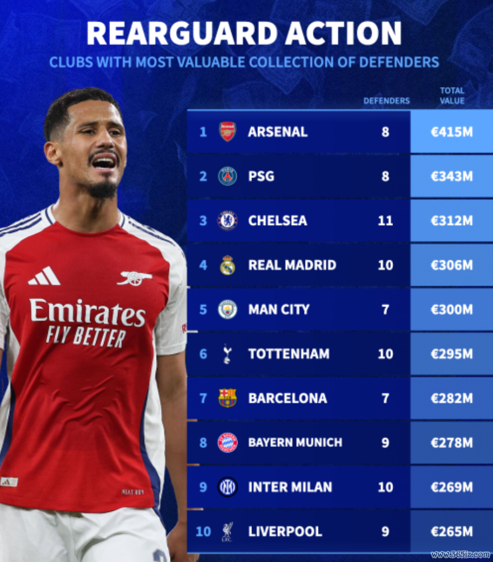 1,阿森纳,8名后卫,身价总值4.15亿欧元