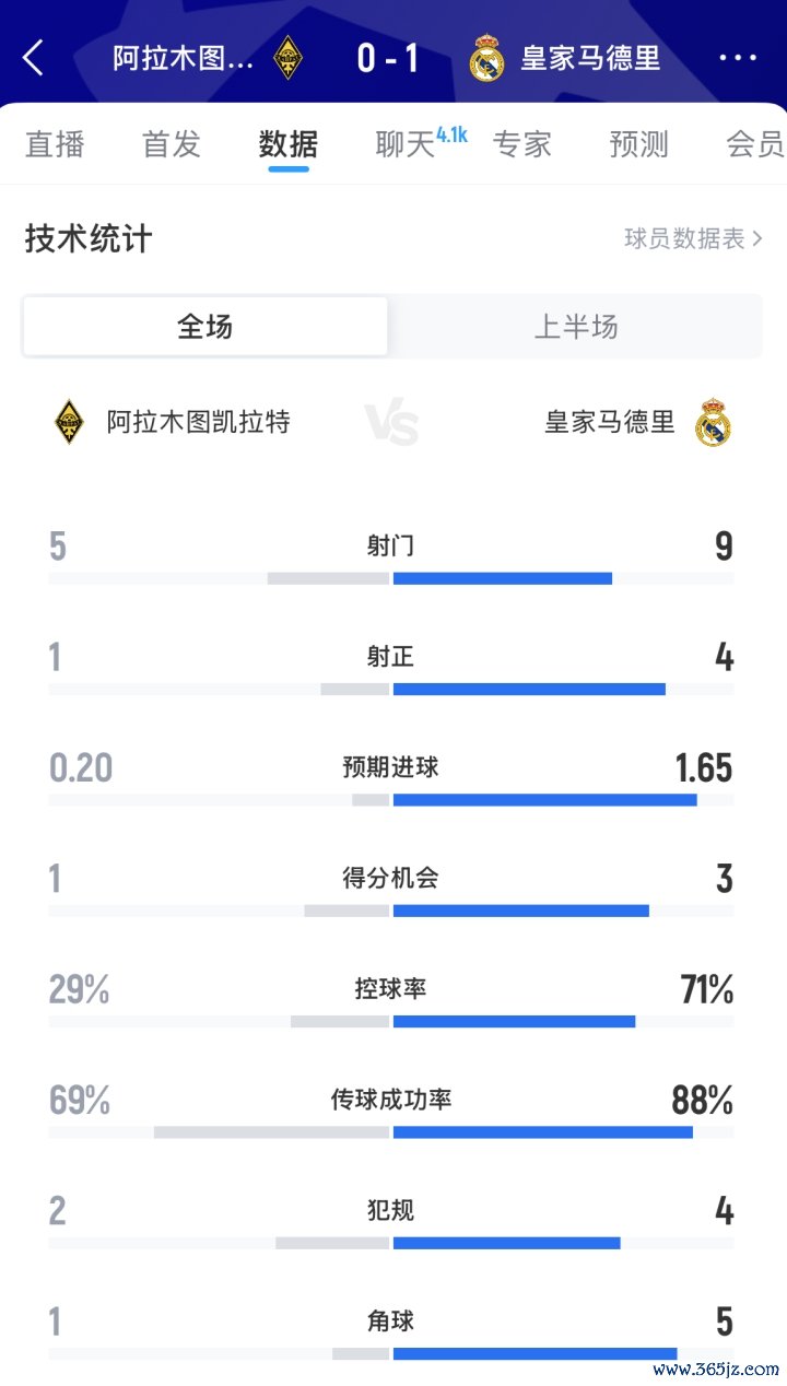 10月01日讯 皇马半场1-0起始凯拉特,半场数据如上图。皇马在射门、射正方面全面占优,控球率跨越7成。