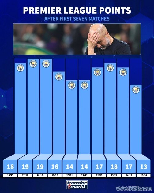 10月6日讯 英超第7轮比赛,曼城客场1-0校服布伦特福德。德国转会市集统计了瓜迪奥拉捏教曼城赛季前7轮比赛的积分,本赛季13分革命低。