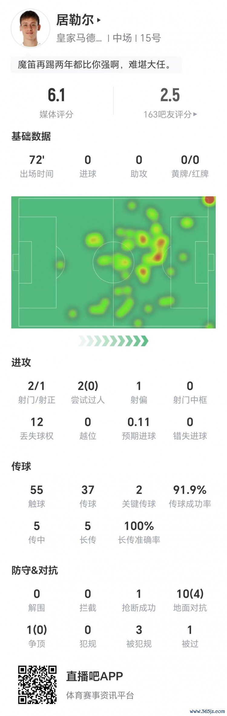 赛后技巧统计数据清晰,居勒尔本场比赛两射1正,两次过东说念主均未生效,12次丢失球权,10次大地抗击4次生效。然而,他送出了两次缺点传球,5次长传沿途生效。